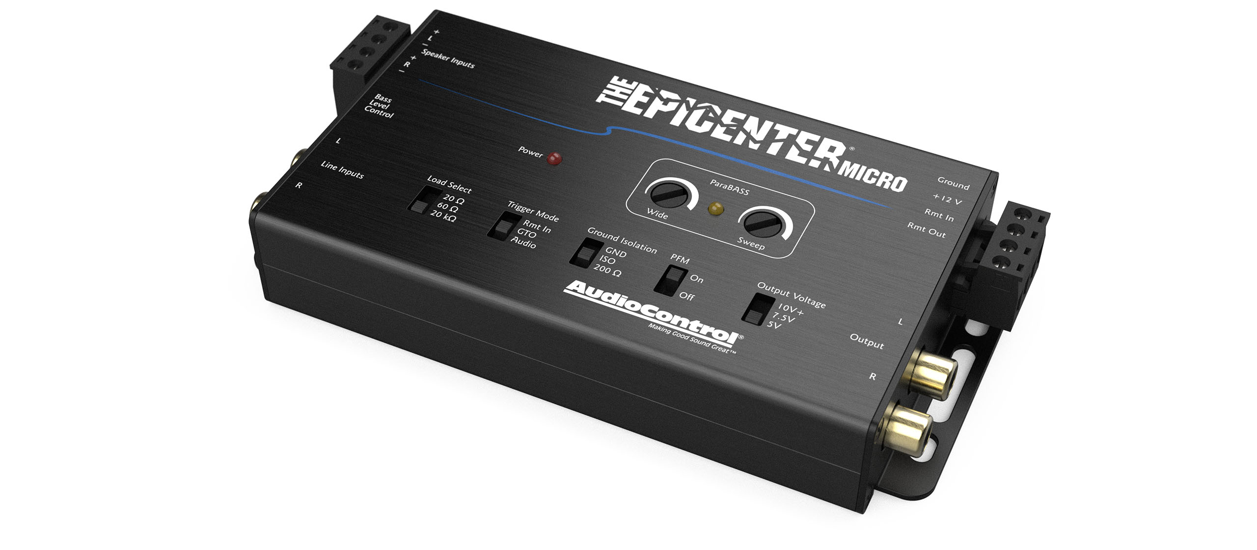 The Epicenter Micro combines AudioControl’s legendary digital bass restoration with world-renowned OEM integration capabilities. Featuring a speaker-level input stage with selectable impedance loads, as well as traditional line-level inputs, The Epicenter Micro brings out the best bass in any system. Trigger modes include traditional +12V remote in, GTO™ Signal Sense, and Audio Sense. The PFM Subsonic Filter can be bypassed for the truly dedicated, and the 10V+ output voltage setting beckons only the bravest among us. Use the included ACR-4 remote to independently adjust bass restoration and output level.